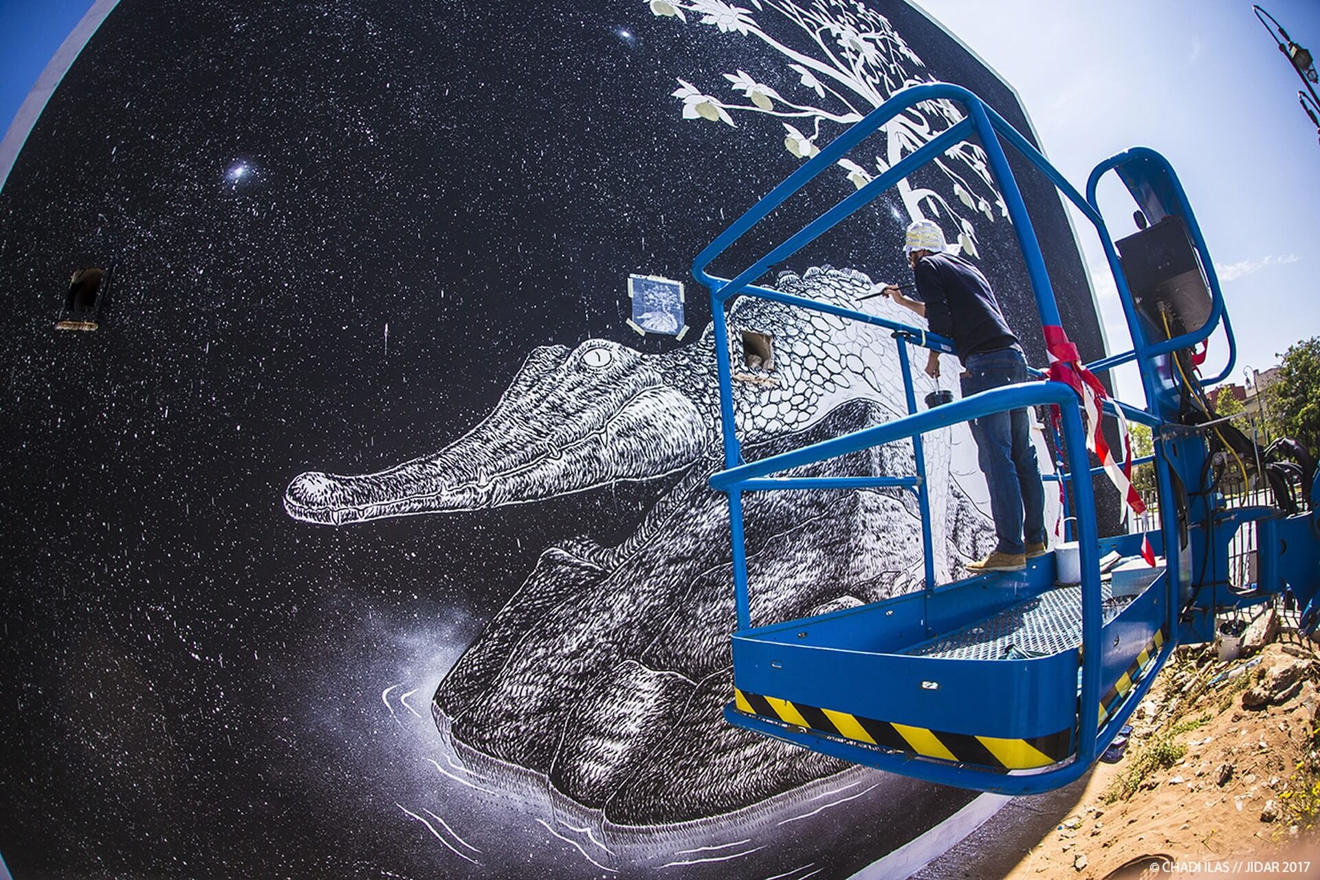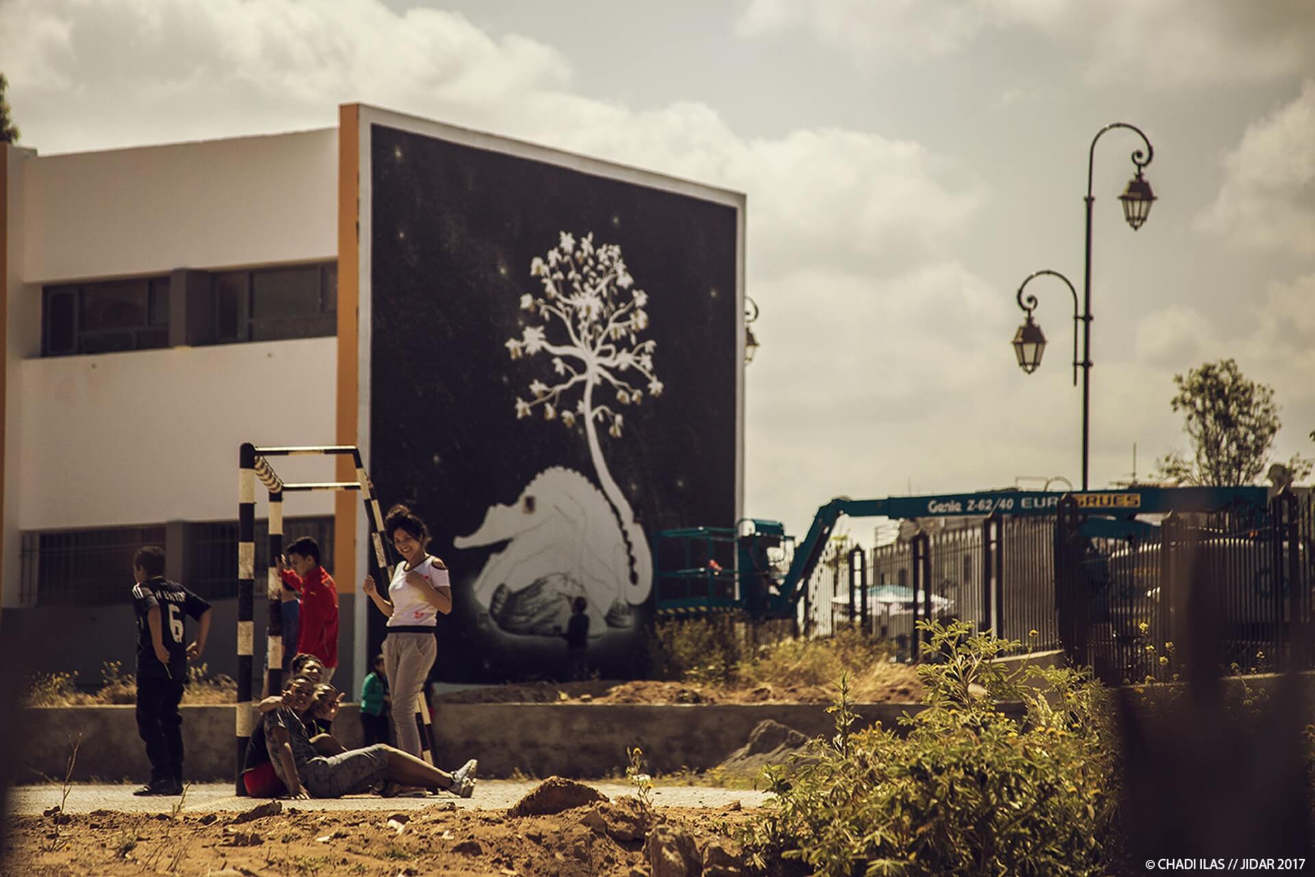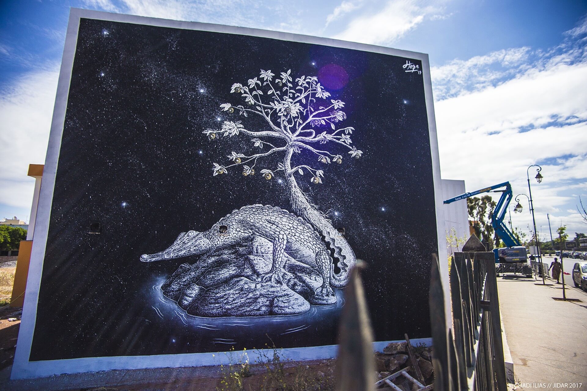 Daniele Nitti, Abderrahim qui répond également au nom Hope, est un grand enfant de 35 ans. Le parcours de cet artiste italien autodidacte, fortement influencé par les contes et les fables de sa jeunesse, a été irrémédiablement marqué par sa lecture du Petit Prince d’Antoine Saint-Exupéry. Ainsi, son univers, teinté de nostalgie, explore les ponts entre rêve et réalité et met en avant la magie des souvenirs, de la faune et des galaxies, parsemant ses œuvres d’animaux et d’étoiles. Deux murs lui seront consacrés sur l’avenue des FAR.