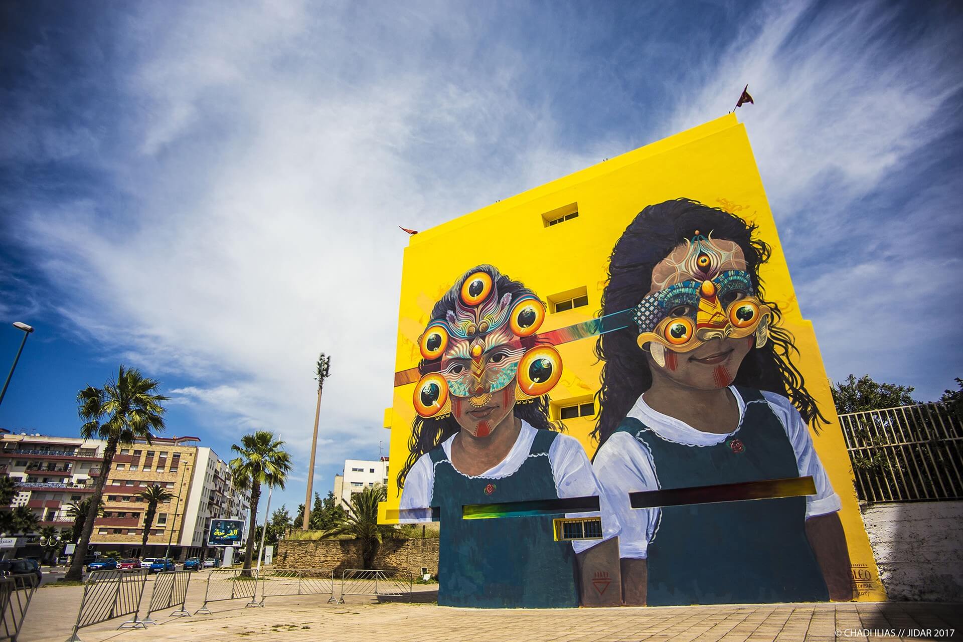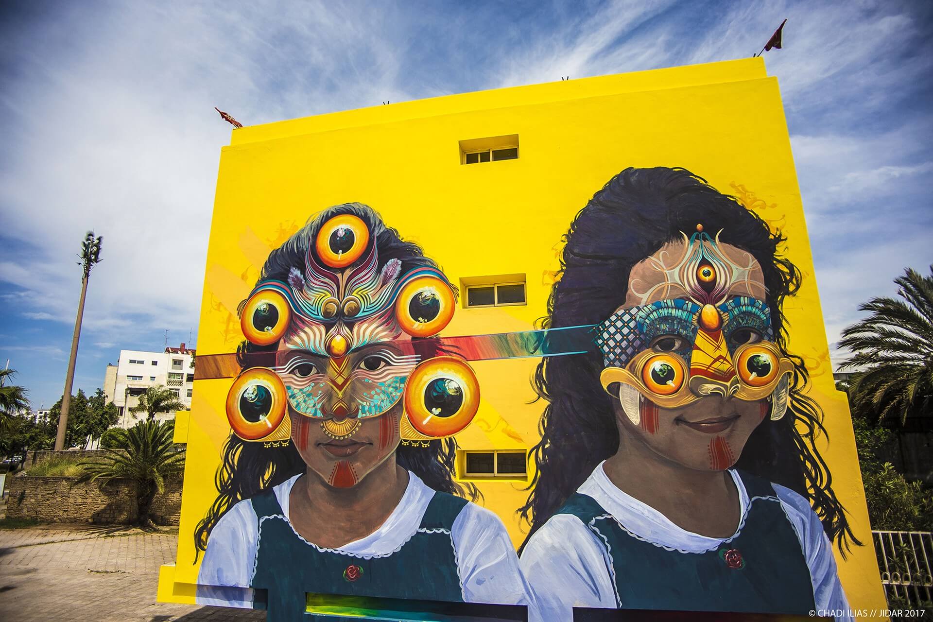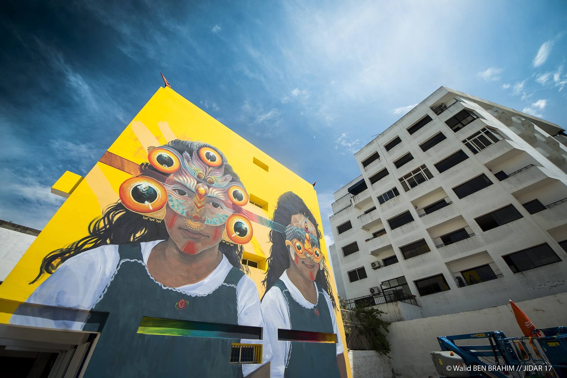 Les oeuvres de GLeo sont une explosion de couleurs, et son nom résonne aujourd’hui comme l’un des plus prometteurs d’Amérique latine. Les fresques gigantesques de cette artiste colombienne, qui est née et qui a grandi à Cali, représentent majoritairement des animaux aux masques bigarrés et des créatures fantastiques, clairement inspirées des cultures et de l‘histoire de son pays, qui semblent provenir d’un monde meilleur. GLeo ne compte plus les expositions et événements street art en Colombie, en Equateur, au Pérou et au Mexique, et s’apprête à mettre en valeur un mur en face de la gare de l’Agdal.