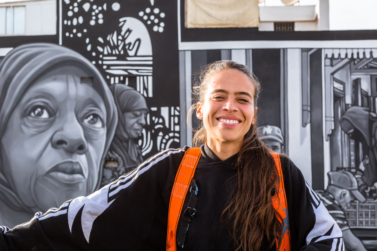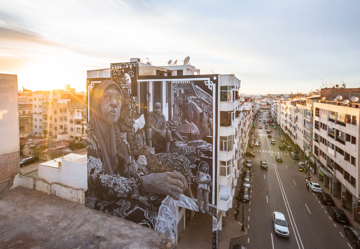Née en 1986 au Mexique, cette artiste réalise des fresques monochromes dans lesquelles des personnages réalistes explorent les thèmes de la communauté et de l’héritage. Son travail est principalement influencé par les illustrations, les formes organiques et un mélange de matériaux inhabituels. Avant de donner vie à un mur blanc et en faire une histoire, elle se documente sur l’histoire et la culture du lieu dans lequel il se situe, notamment en s’immisçant dans la vie de ses habitants.